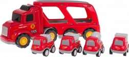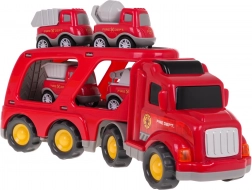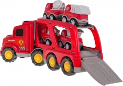 Zábavná sada pre malých hasičov od 3 rokov: veľký červený prepravník s odpojiteľným návesom a štyrmi mini vozidlami. Ponúka svetelné efekty, reálne zvuky štartu, jazdy a klaksónu a otváraciu rampu pre jednoduché nakladanie. Kvalitný plast v živých farbách podporuje fantáziu a jemnú motoriku. Batérie sú súčasťou balenia.