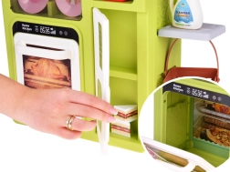 Kuchynská linka je ladená do tlmených farieb, vďaka čomu sa skvele hodí do každého interiéru, a vďaka mnohým otváracím prvkom, ako sú skrinky, rúra a chladnička, do nej môžu svoje kuchynské doplnky ukladať aj batoľatá.
