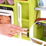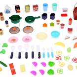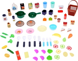 Kuchynka obsahuje riad, hrnce, príbor a hračkárske potraviny vrátane košíka na zeleninu a triediacich priehradiek.
