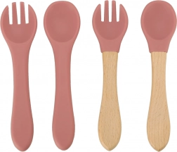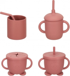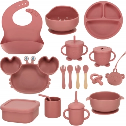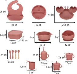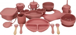 Kompletná sada silikónového riadu pre deti v tmavej ružovej farbe obsahuje taniere, misky, šálky a príbor. Riad je vyrobený z bezpečného silikónu, ľahko sa čistí a je ideálny pre učenie samostatného stravovania.