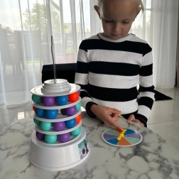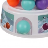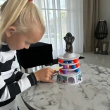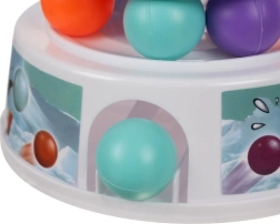Čo nájdete v balení: pevná základňa s výhozom guličiek a 2 samolepkami, 36 guličiek v 4 farbách (svetlomodrá, modrá, oranžová, fialová), 3 krúžky na stavbu veže, ruleta a 2 tyčinky na vyťahovanie guličiek.