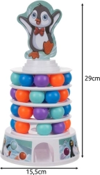 Postavte stabilnú vežu, nasádzajte do každého poschodia 9 farebných guličiek, nasaďte obrubný krúžok a navrch umiestnite kopulu s tučniakom. Hráči sa striedavo roztočia ruletu a podľa padnutej farby pomocou paličiek vyťahujú guličky tak, aby sa veža nezrútila. Guličky prepadnú dovnútra a vyjdú otvorom v podstavci – napätie rastie s každým ťahom!
