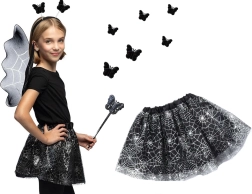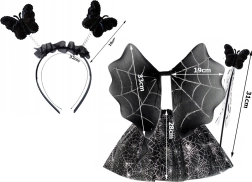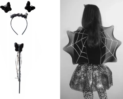 Tento halloweensky kostým pre deti kombinuje očarujúci vzhľad a pohodlie. Čierna tylová suknička so striebornou pavučinovou potlačou sa krásne trbliece, ľahké krídla na gumičke sa ľahko nasadzujú a čelenka s motýľmi na pružinkách dodá celému prevleku hravý efekt. Všetko je vyrobené z ľahkej polyesterovej látky, ktorá neobmedzuje v pohybe.
