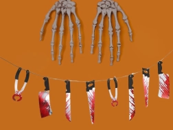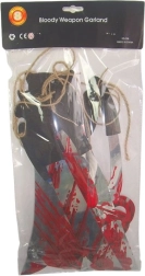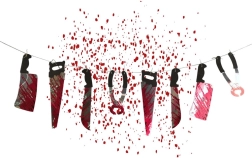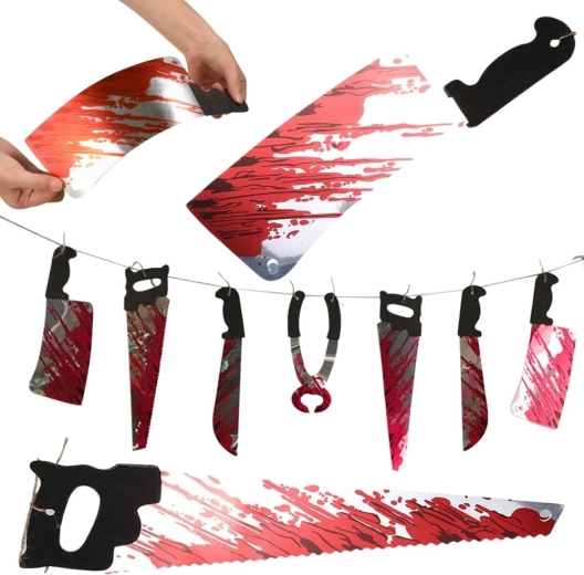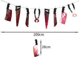 Halloweenska girlanda s krvavými nástrojmi je perfektnou voľbou na hororové párty, tematické večierky aj dekor výkladu. Zobrazené nástroje s červenými „šmuhami“ vytvárajú autentický strašidelný efekt, pričom sú vyrobené z ľahkého a netoxického materiálu pre bezpečné použitie.