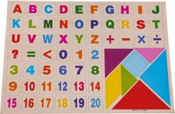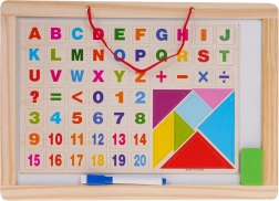 Obojstranná tabuľa, suchý fix, krieda, hubka, 54 ks magnetiek s písmenami a číslami, 7 ks geometrických tvarov, obrazový návod