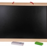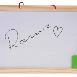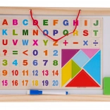 Táto drevená tabuľa podporuje prirodzenú detskú zvedavosť a učenie hrou. Jedna strana je čierna kriedová na kreslenie a písanie kriedami, druhá biela suchostierateľná na písanie fixkou. Vďaka magnetkám s písmenami a číslicami deti ľahko precvičia abecedu, počítanie aj tvary.