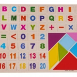 - Obojstranná tabuľa, suchý fix, krieda, hubka, 54 ks magnetiek s písmenami a číslami, 7 ks geometrických tvarov, obrazový návod