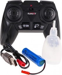 Diaľkové ovládanie 2,4 GHz umožňuje plynulé riadenie vpred, vzad, vpravo aj vľavo bez rušenia. Integrovaný nabíjací akumulátor 3,7 V 500 mAh zaistí dostatok energie na hranie, nabíjanie prebieha cez USB. Efekt dymu aktivujete pomocou priloženej fľaštičky na vodu pre ešte realistickejší zážitok.