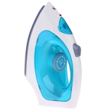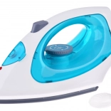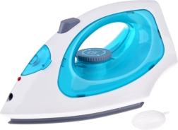 Žehlička je vyrobená s dôrazom na detail v bielej a tyrkysovej farbe, vrátane nastaviteľného teplotného gombíka.