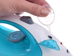 Žehlička má uzatvárateľnú nádržku na vodu a k hračke je priložená fľaštička pre jednoduché plnenie.