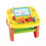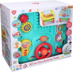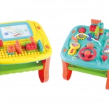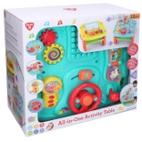 Obojstranný aktívny stolík 37 cm spája zábavu a učenie v jednom. Horná strana s volantom, radiacou pákou a hrkálkami rozvíja jemnú motoriku a zmyslové vnímanie, zatiaľ čo spodná strana s magnetickou kresliacou tabuľkou a podložkou na kocky podporuje kreativitu a predstavivosť.