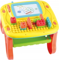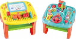 Zábavný obojstranný stolík pre deti prináša dve hracie plochy v jednom: na hornej strane nájdete volant, radiacu páku a hrkálky, na spodnej zas magnetickú kresliacu tabuľku a podložku na stavanie kociek. Súčasťou balenia sú kocky, melódie aj batérie, takže je hneď pripravený na použitie. Kompaktná veľkosť 37 cm sa hodí do každej detskej izby.