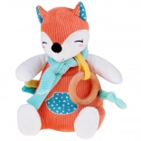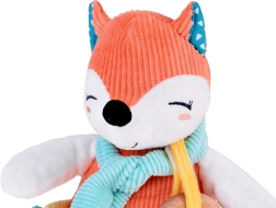 Líška je vyrobená v upokojujúcich farbách, ktoré kombinujú oranžovú s bielymi a tyrkysovými detailmi, čo prispieva k vizuálnej stimulácii bábätka.