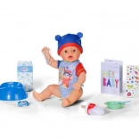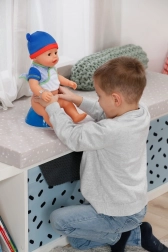 Predstavujeme Jonasa! Bábiku Jonasa, známu z animovaného seriálu BABY born, ktorý môžete sledovať na kanáli BABY born v češtine na YouTube, môžete mať teraz aj doma. V novom oblečku a s 10 doplnkami. Prináša si so sebou aj magický tanierik: keď do tanierika s bielou doštičkou vo vnútri nalejete trochu vody, na doštičke sa objaví lahodné jedlo s roztomilou tváričkou, ktoré z kŕmenia bábiky urobí ešte väčšiu zábavu. Keď Jonasa po nakŕmení (vodou) alebo po napití vody z fľaštičky posadíte na nočník a stlačíte mu bruško, na doštičke v nočníku sa objaví obrázok cikania a kakania. Keď sa Jonas napije vody z fľaštičky, môže roniť slzy a treba ho utíšiť. Pomôcť môže napríklad magický cumlík: keď ho v pusinke otočíte o 180 stupňov, očká sa mu buď otvoria alebo zatvoria. Otočte ešte raz a stane sa opak. Jonas však dokáže ešte viac: má pohyblivé kĺby a môžete ho vziať aj do vane. Teraz dokonca vyschne rýchlejšie než kedykoľvek predtým: aby ste bábiku po hraní dobre vyčistili, je možné odňať jednu nohu a vytvoriť tak väčší otvor na čistenie bábiky. Voda tak z bábiky ľahšie odtečie. Pre ešte zaujímavejšiu hru si Jonas do svojho nového domova okrem fľaštičky, cumlíka, tanierika s doštičkou s obrázkom jedla a nočníka s doštičkou s obrázkom cikania a kakania prináša aj plienku, rodný list, arch samolepiek a dva náramky priateľstva – jeden pre bábiku a jeden pre jej malú mamičku – na dôkaz dlhého a láskavého priateľstva medzi dieťaťom a bábikou.