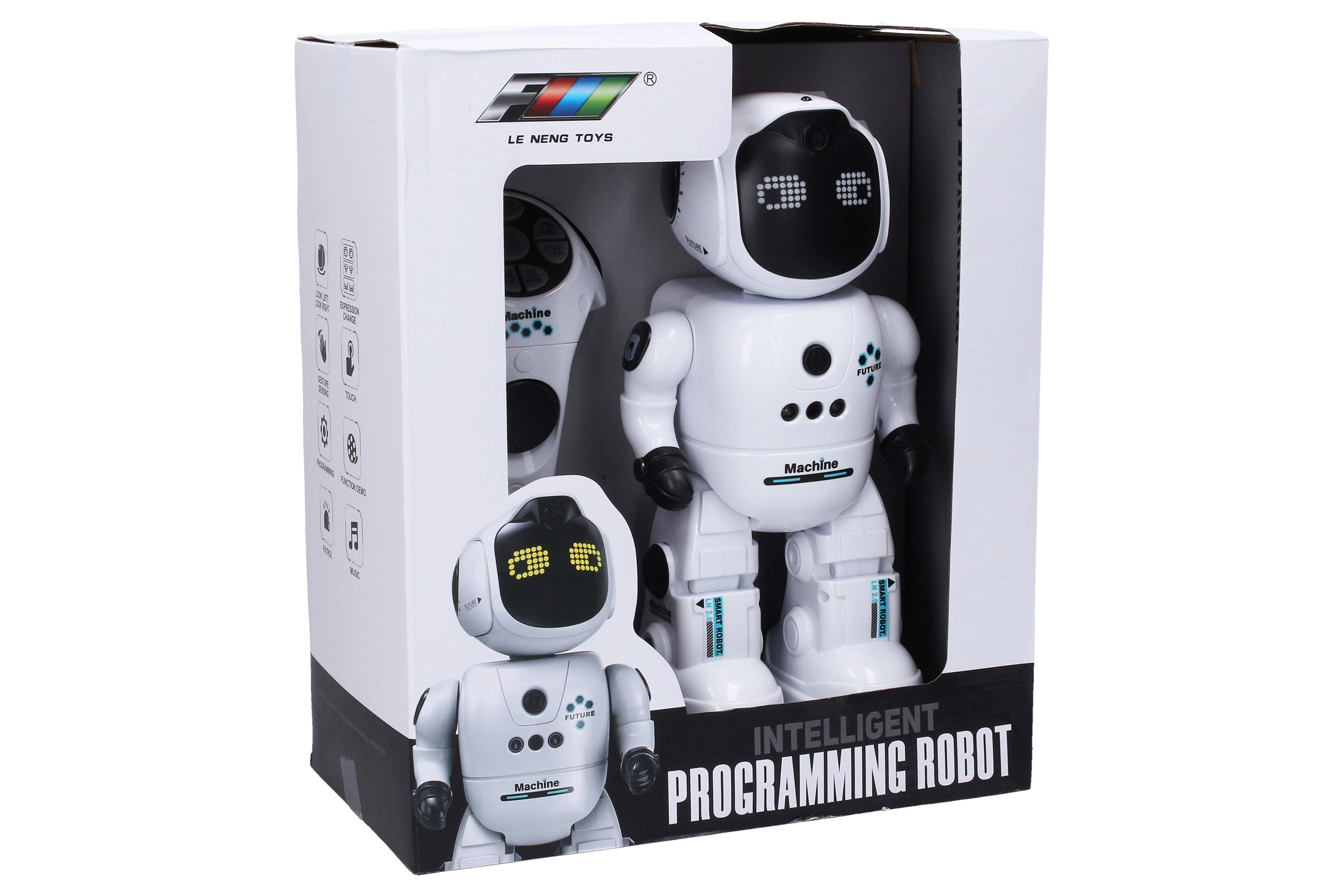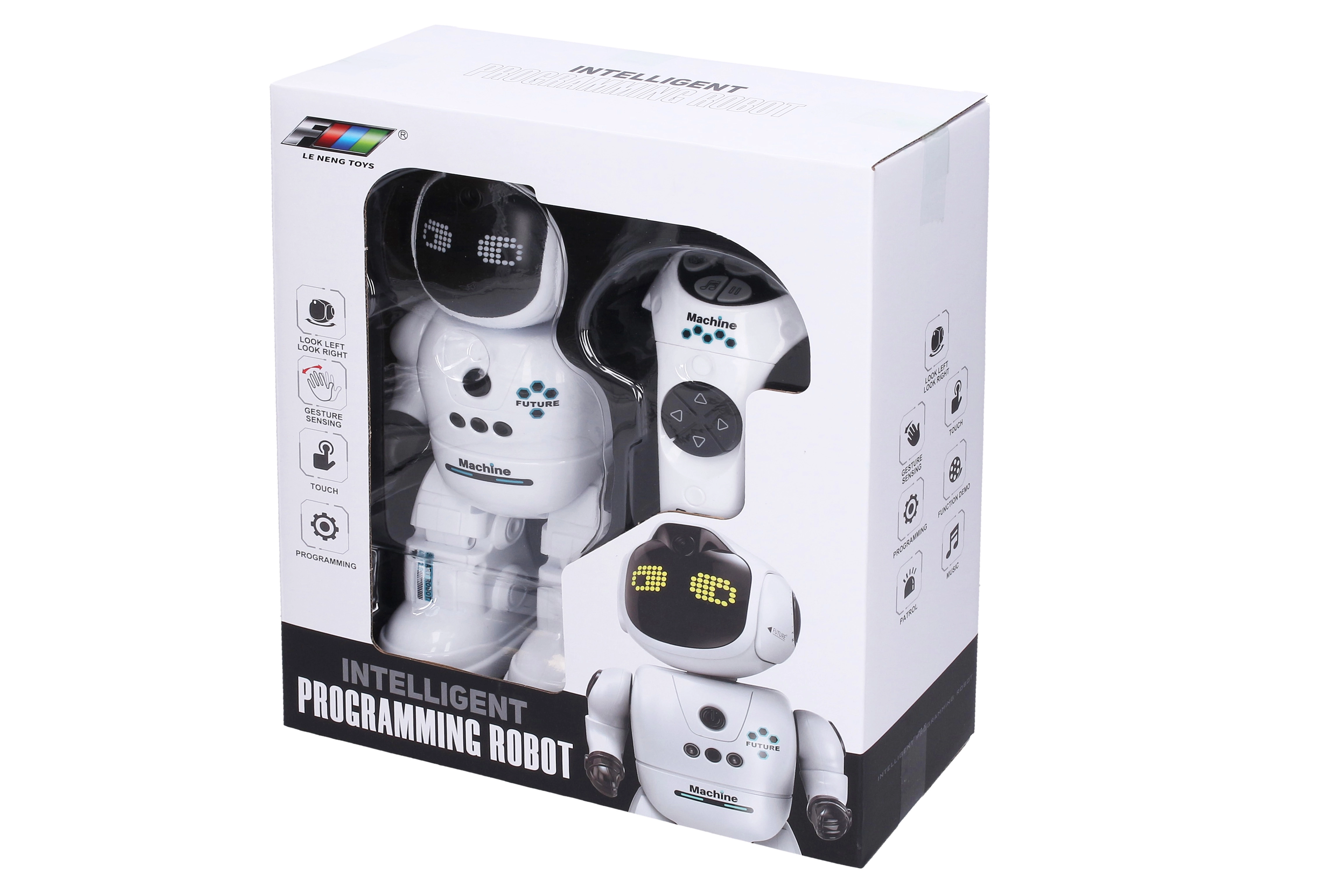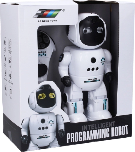 Robot ponúka režim programovania, demo ukážky, zvuky a hudbu s nastavením hlasitosti. Ovládanie je intuitívne – stačí gesto, dotyk alebo stlačenie tlačidiel. Tlačidlo ON/OFF nájdete pohodlne na jeho hrudi. Nabíjanie prebieha cez USB kábel (súčasť balenia), do ovládača stačí vložiť 2× AAA batérie (nie sú súčasťou).