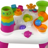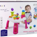 Tento multifunkčný edukačný stolík v ružovo-bielom prevedení ponúka pestrú škálu aktivít pre zmyslový rozvoj a zábavu. Dieťa sa hravou formou učí rozlišovať farby a tvary, trénuje manuálne zručnosti a sleduje príčinu a následok – napríklad pri spúšťaní guličiek po šmykľavke.