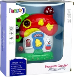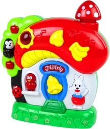 Interaktívny domček je perfektnou voľbou na každodenné hranie aj večerné upokojenie. Zvuky prírody bábätko utíšia a naladia na spánok, zatiaľ čo zvieratká vydávajú svoje charakteristické zvuky. Dvojitým stlačením spustíte hudobný podkres, o vizuálne vnemy sa stará malý svietiaci muchotrávka a svetielko na streche.