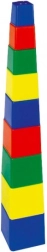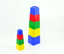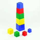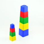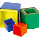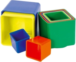 Deväť farebných plastových kociek pre najmenších podporuje rozvoj jemnej motoriky, logického myslenia a koordinácie oko–ruka. Duté kocky možno skladať do veže aj vkladať do seba, najväčšia má 9 × 9 × 9 cm. Vhodné od 1 roka, vyrobené v ČR. Farebné prevedenie je v mixe farieb podľa skladových zásob.