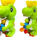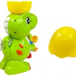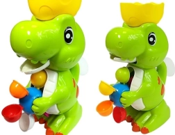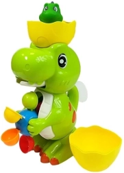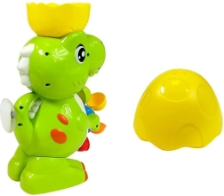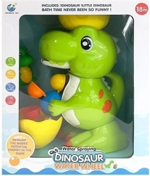 Zelený dinosaurus má tiež svojho malého, s ktorým sa váš drobček môže vo vode tiež hrať. Pestrofarebný navijak zaistí vášmu dieťaťu zábavu pri každom kúpaní. Treba nabrať vodu a potom ju naliať do polovice škrupiny na hlave dinosaura. Voda bude vytekať dinosaurou tlamou a potom stekať po farebných bubnoch a uvádzať ich do pohybu.