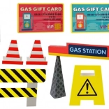 - Čerpacia stanica, 2 autíčka (domiešavač a hasičské), dopravné doplnky (svetelná križovatka, značky, kužele, bariéra), 2 „karty“