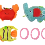 - 3 závesné plyšové hračky (rybka – rolnička, sloník – melódia, krab – píšťalka)