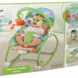 Multifunkčné detské ležadlo a hojdátko 2v1 v zelenom prevedení ponúkne upokojujúce vibrácie, jemné kolísanie a závesný oblúk s plyšovými hračkami na rozvoj zmyslov. Vďaka nastaviteľnému sedadlu, prateľnému poťahu a 3-bodovému pásu je bezpečné a pohodlné od prvých dní života až do cca 3 rokov (do 18 kg).