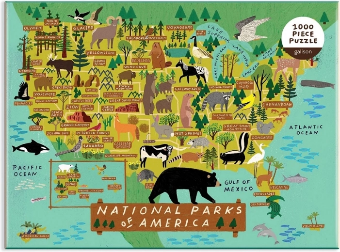 Štýlové puzzle od značky GALISON prináša detailnú ilustráciu mapy Spojených štátov so vyznačenými národnými parkami a typickými zvieratami. Vďaka 1000 dielikom si užijete dlhé hodiny skladania a výsledkom bude pôsobivý panoramatický obraz vhodný aj na zarámovanie.
