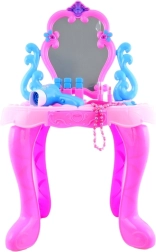 Tento nádherný toaletný stôl je ideálny pre všetky malé princezné. Jeho čaro prináša vďaka funkčnému fénu a svetielku na vrchu zrkadla, ktoré svieti a hrá po vložení batérií. Súčasťou balenia je hrebeň, korále, 3 prstene, samolepky a ďalšie kreatívne doplnky.