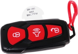 Štýlová kľúčenka ovláda svetlomety a osvetlenie motora a prehráva zvuky zamknutia/odomknutia aj klaksónu. Batéria CR2025 je súčasťou balenia.