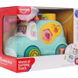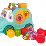 Stlačením tlačidla sa spustia zvukové efekty – štart motora, klaksón aj veselé melódie – sprevádzané blikajúcimi svetielkami. Zadné dvierka sa otvárajú pre pohodlné vybratie loptičiek a kociek. Hračka je vyrobená z kvalitných, bezpečných materiálov v živých farbách a je ideálna na každodenné hranie.
