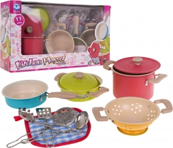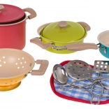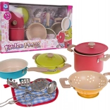 Táto farebná sada detského riadu prináša autentický zážitok z varenia do každej detskej kuchynky. Dva hrnce s pokrievkami, panvica, cedidlo a štyri praktické kuchynské nástroje poskytujú všetko, čo deti potrebujú na napodobňovanie skutočného varenia. Vďaka kovovým materiálom je sada pevná, odolná a pripravená na každodenné hranie.