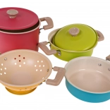 Dva hrnce s pokrievkami, panvica a cedidlo z kovu pôsobia skutočne a vydržia intenzívne detské hranie.