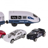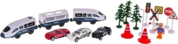 - Koľaje, stanica, most, vlak, 4× dopravná značka, semafor, lampa, 3× stromček, 2× kužeľ, 2× závora, 3× autíčko, figúrka