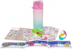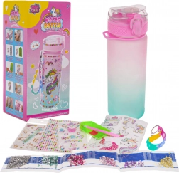 Samosamolepiaca fľaša na vodu pre deti od 3 rokov. Sada obsahuje fľašu na vodu, hárky s diamantmi a postavičkami jednorožcov, nálepky so šablónou, 6 vrecúšok s diamantmi, kľúčenku so šnúrkou, pero na nanášanie diamantov, zásobník a lepiaci štvorček. Fľaša sa veľmi ľahko otvára a zatvára a je vzduchotesná. Materiál fľaše je netoxický, vhodný pre deti a neobsahuje BPA. Sada podporuje kreativitu, predstavivosť a praktické zručnosti.