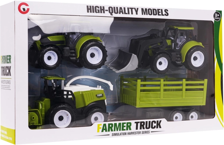 Dva traktory, kombajn a príves s autentickými detailmi podporujú kreatívnu hru a rozvoj motoriky. Ideálne pre malých fanúšikov poľnohospodárskej techniky.