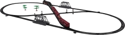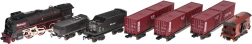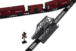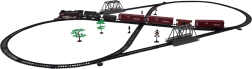 - lokomotíva cca 23 cm x 8 cm x 5,5 cm .- osobný vozeň cca 13 cm x 6 cm x 4,5 cm, .- uhoľný vozeň cca 14,5 cm x 7 cm x 4,5 cm, .- vozeň s pilotom cca 12,5 cm x 5 cm x 4,5 cm, .- vozeň s kontajnermi cca 22,5 cm x 7 cm x 4,5 cm, .- trať cca 216 cm x 99 cm, .- balenie cca 87,5 cm x 43 cm x 9,5 cm, . |