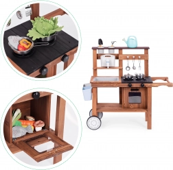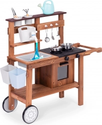 Táto robustná detská kuchynka kombinuje radosť z hraní rolí s objavovaním prírody. Vďaka odolnému jedľovému drevu je ideálna na použitie v interiéri aj exteriéri. Deti môžu „variť“ z piesku, blata a kamienkov, napúšťať vodu do drezu a pomocou otočných gombíkov „nastavovať teplotu“.