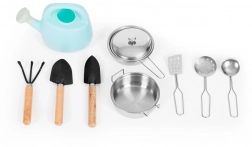 - 10 ks (hrniec, pokrievka, panvica, špachtľa, sitko, naberačka, kanva, 3× záhradné náradie)