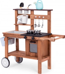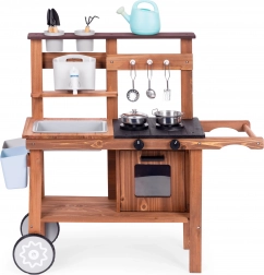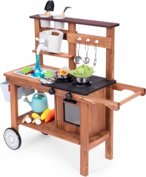 Detská vonkajšia blatová kuchynka z jedľového dreva od značky ECOTOYS prináša realistickú hru na varenie doma aj na záhrade. Ponúka funkčný kohútik s nádržkou na vodu, otočné gombíky horákov s kliknutím, drez, skrinku/rúru a praktické kolieska na jednoduché presúvanie. Súčasťou je sada kovových a záhradných doplnkov, vďaka ktorým deti rozvíjajú kreativitu a jemnú motoriku.