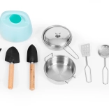 Múdre detaily ako funkčný kohútik, otváracie dvierka ku skrinke či „rúre“ a kolesá s gumovým behúňom pre šetrný presun robia z kuchynky obľúbené herné stanovište. Bohatá sada príslušenstva (hrniec, panvica, naberačka, sitko, špachtľa, kanva a záhradné náradie) podnecuje fantáziu a podporuje samostatnú hru.