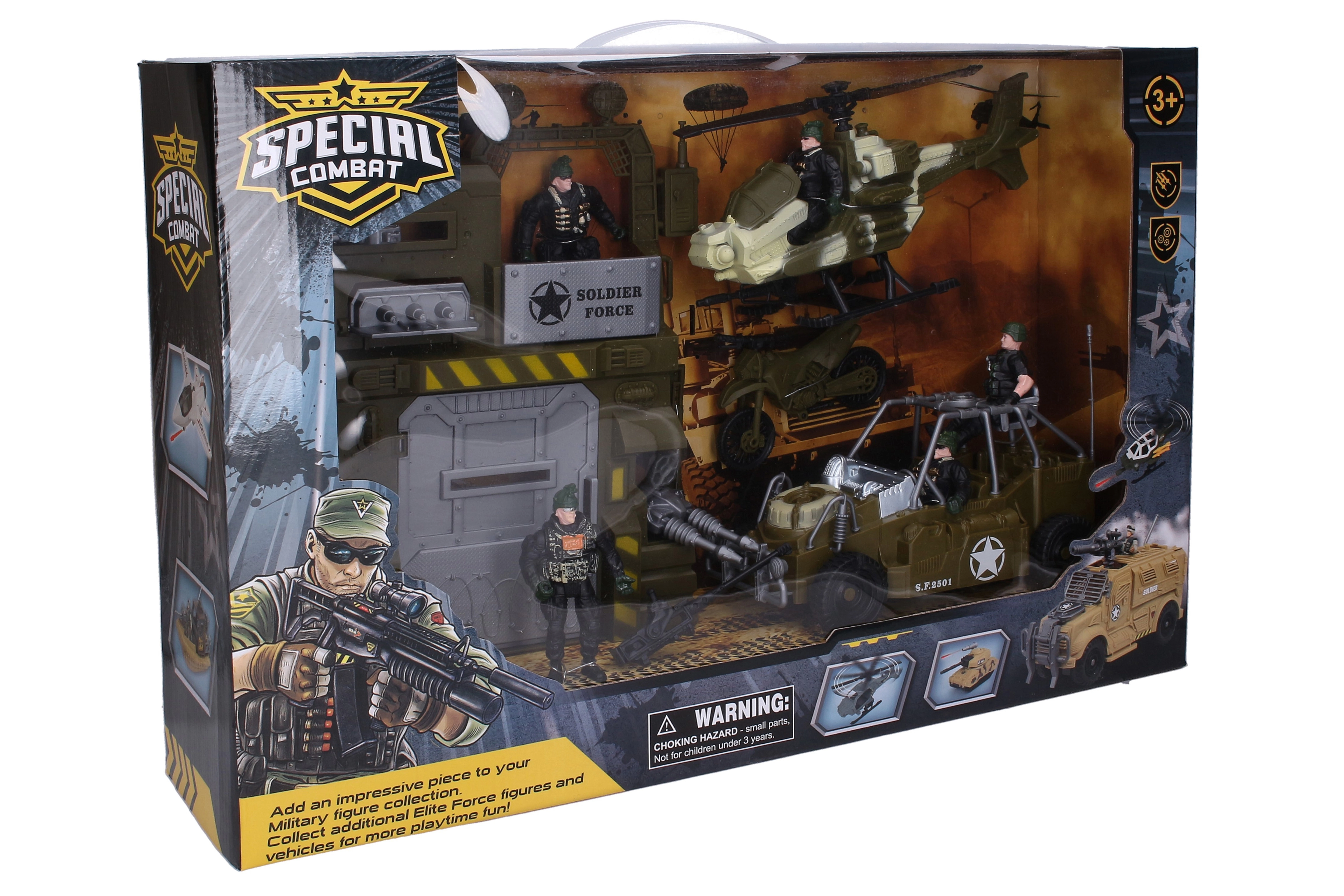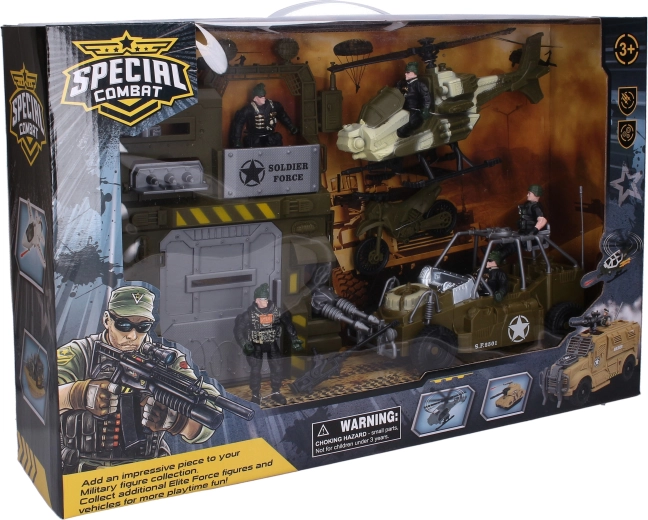 Tento detailne spracovaný vojenský set prináša deťom napínavú akciu na súši aj vo vzduchu. Vďaka vozidlám – autu, vrtuľníku a motorke – môžu malí prieskumníci zmapovať terén, brániť pevnosť a vytvárať vlastné misie. Súčasťou balenia je päť elitných vojakov pripravených na každú operáciu.