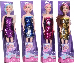 Obliecť, učeš a hurá do mesta za zábavou! Táto štýlová bábika s farebným pruhom vo vlasoch a šaty so flitrami, ktoré menia farbu po prechode rukou, je ideálna pre každú malú slečnu.