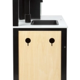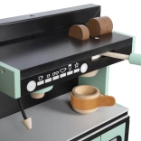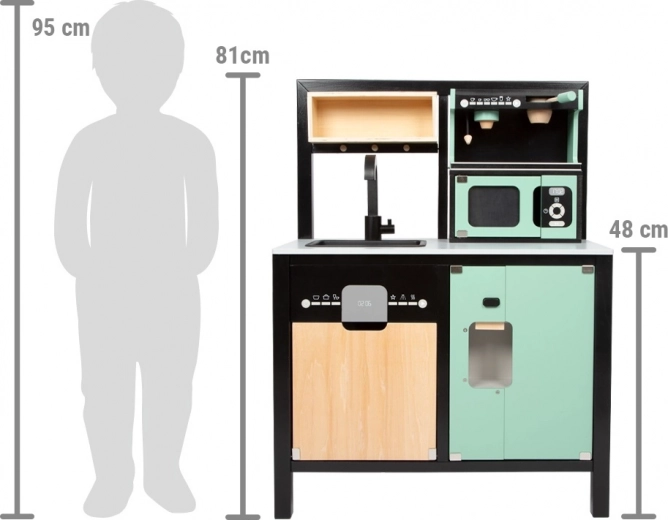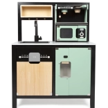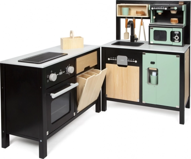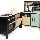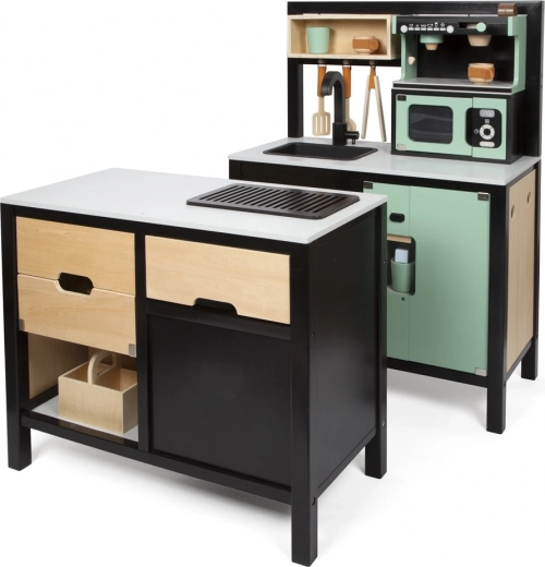 Štýlová drevená detská kuchynka v industriálnom vzhľade kombinuje čierny rám a prírodné drevo, ponúka praktický kuchynský ostrovček a množstvo realistických spotrebičov a príslušenstva. Nechýba varná doska, rúra, mikrovlnná rúra, chladnička s výrobníkom ľadu, kávovar ani riad. Podporuje predstavivú hru, rozvoj rolových hier a sociálnych zručností.