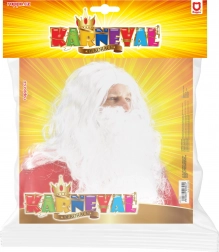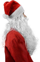 Táto parochňa s dlhými bielymi fúzmi a klobúkom vytvára tradičný mikulášsky vzhľad.