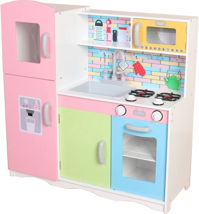 Farebná drevená kuchynka je perfektná pre všetky malé kuchárky a kuchárov. Vyrobená z kvalitného dreva a v modernom dizajne, táto kuchynka zaručuje bezpečnosť vďaka absencii ostrých hrán. Poteší otočnými gombíkmi na rúre a varnej doske, ktoré vydávajú zvukové efekty. Dvierka mikrovlnnej rúry, chladničky, skrinkiek a rúry sú vybavené systémom bezpečného zatvárania.