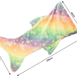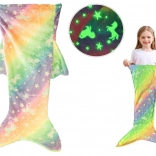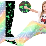 Očarujúca detská deka v tvare chvosta morskej panny v dúhových farbách so vzormi jednorožcov a hviezdičiek. Je mimoriadne mäkká a hrejivá, ideálna na relax, čítanie aj sledovanie rozprávok. Motívy po zhasnutí svetla svietia v tme, takže premenia každý večer na kúzelné dobrodružstvo. Hebký flís sa postará o teplo a pohodlie a zábavný dizajn podporí fantáziu a hravosť.