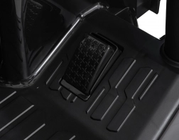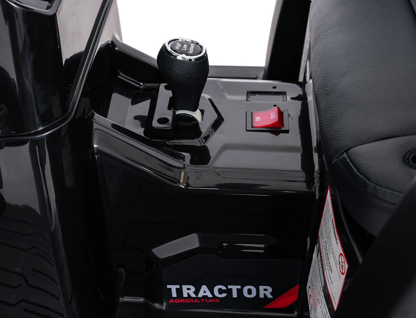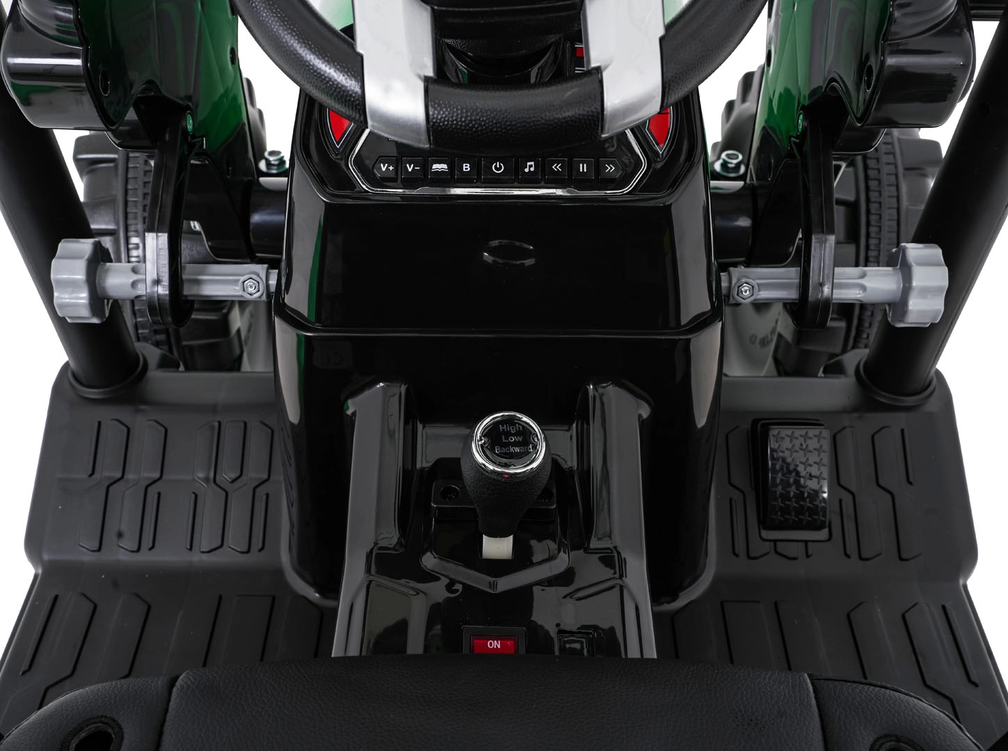 Pre bezpečie a pohodlie nechýba diaľkové ovládanie 2,4 GHz s núdzovým zastavením, široké sedadlá z eko kože a veľké kolesá s výrazným vzorom. Deti si užijú jazdu s LED svetlami a bohatou výbavou audiopanelu – MP3, USB, Bluetooth, vstavané melódie a zvuky vo volante.