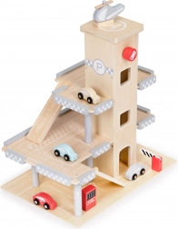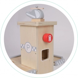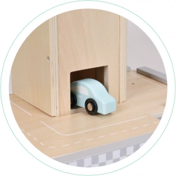 Táto štýlová drevená garáž poteší každé dieťa, ktoré miluje autá a tvorivú hru. Vďaka trom úrovniam, plynulým rampám a výťahu zastavujúcemu na každom poschodí ponúkne hodiny zábavy a rozvíja jemnú motoriku aj fantáziu.
