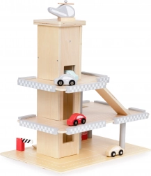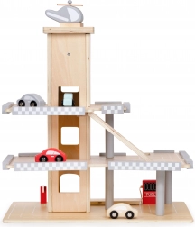 Súčasťou je vrtuľník s pristávacou plochou na streche, 4 autíčka, čerpacia stanica a pohyblivá závora pre realistickú hru. Kvalitné drevené prevedenie bez ostrých hrán zaručuje 100 % bezpečné hranie.