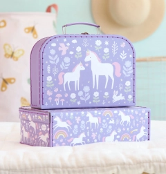 Sada dvoch dekoratívnych kufríkov od A Little Lovely Company prináša hravý dizajn s jednorožcami, dúhou a kvetmi na fialovom podklade. Ľahká a zároveň pevná konštrukcia z odolného kartónu s kvalitným prešívaním zaručuje dlhú životnosť a pohodlné prenášanie.
